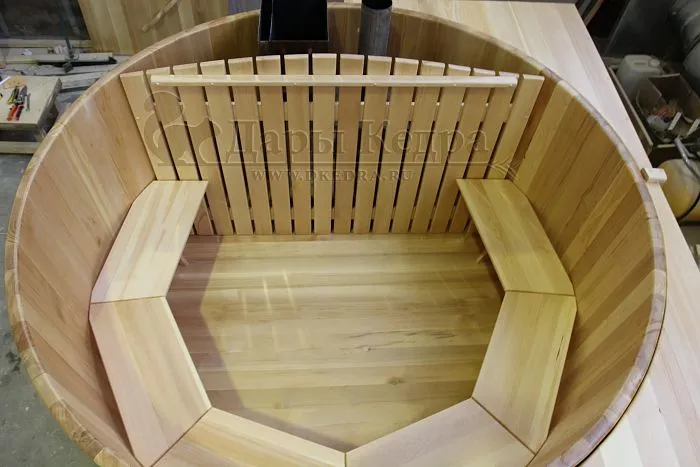 Кедр — влагостойкий материал с приятным хвойным ароматом, мало усыхает. Природный антисептик, насыщает воду и воздух вокруг фитонцидами, благотворно влияющими на здоровье.